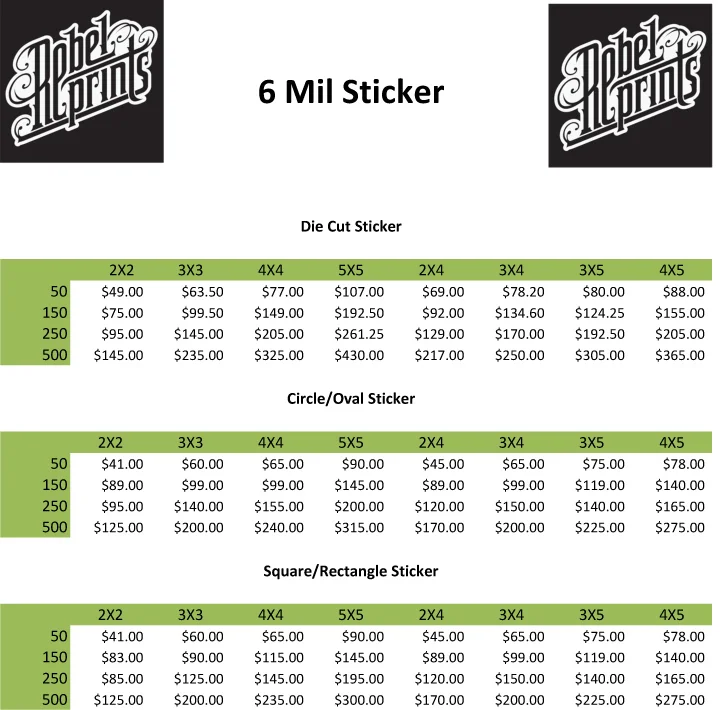 We only print on the highest quality vinyl stock (3 mil) with solvent inks, and we offer a FREE UV (3 mil) matte laminate finish over the vinyl to ensure the highest quality custom stickers. Lamination also helps the longevity of our products from fading, scratching, and weather proofs them. Our Product will last outdoors and be fade free for up to 5 years. All stickers are separated and packaged in groups or 100 or 50. We print in full color CMYK so you can print anything from vector artwork to paintings, and illustrations.